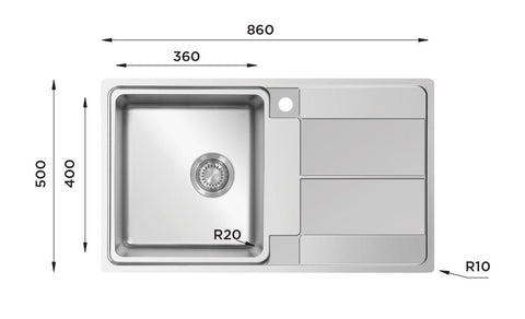 | Corner Radius | R20 (bowl) & R10 (drainer) |